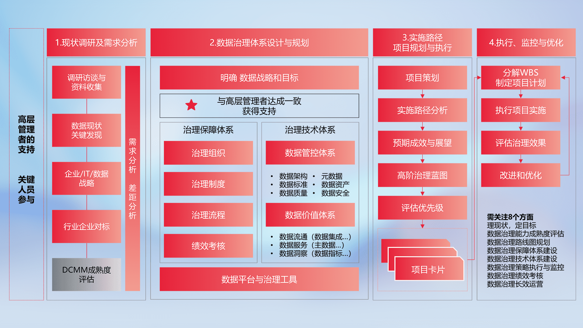 制定并执行统一的数据标准,,,规范数据定义和格式,,,,消除冗余和不一致性,,实现跨部门和跨系统的数据一致性,,,,为企业提供标准化的数据基础。。